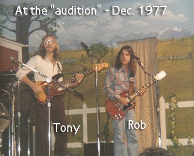 We spent two weeks recording that album and ran out of money in such a hurry that we had little time for mixing it. The studio took pity on us and gave us half a day to do reference mixes to take with us. I immediately began to send cassette tapes of those mixes to all the major record companies and many of the new independent labels that were just starting up in the late 70's. In the meantime, to keep our chops up, we continued to rehearse our newly recorded material. On a cold December day I was contacted by the manager of the Jimmy Castor Bunch in New York, who had received one of my cassettes and expressed a desire to sign us. He and an associate came to Mountain Home and attended a concert we put on ourselves just for the "audition". Our audience consisted of family and friends. I even arranged to have the concert videotaped to have something to send to other interested parties. Two hours before the concert we had no word of our special guests, who were to have flown to Springfield and then rented a car to drive the remaining 125 miles down to Mountain Home. An hour before the show and still no word. By fifteen minutes before show time I had become a nervous wreck. All our friends and families were patiently sitting out there - waiting for us to take the stage. The camera crew was standing around. The PA crew was ready. The band was pumped. No "guests". Should we start the gig without them? And why? THEY were the whole reason we had set all this up. What would be the point? We HAD to keep everyone waiting.
